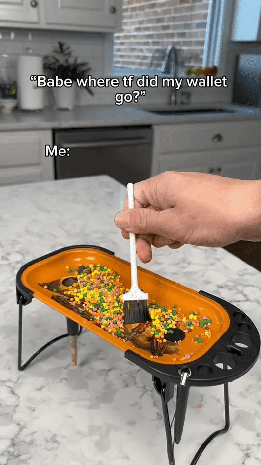 First, she adds some paper to the candy funnel and drops them into the table